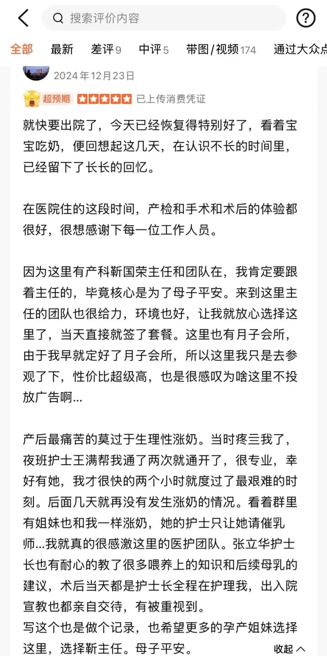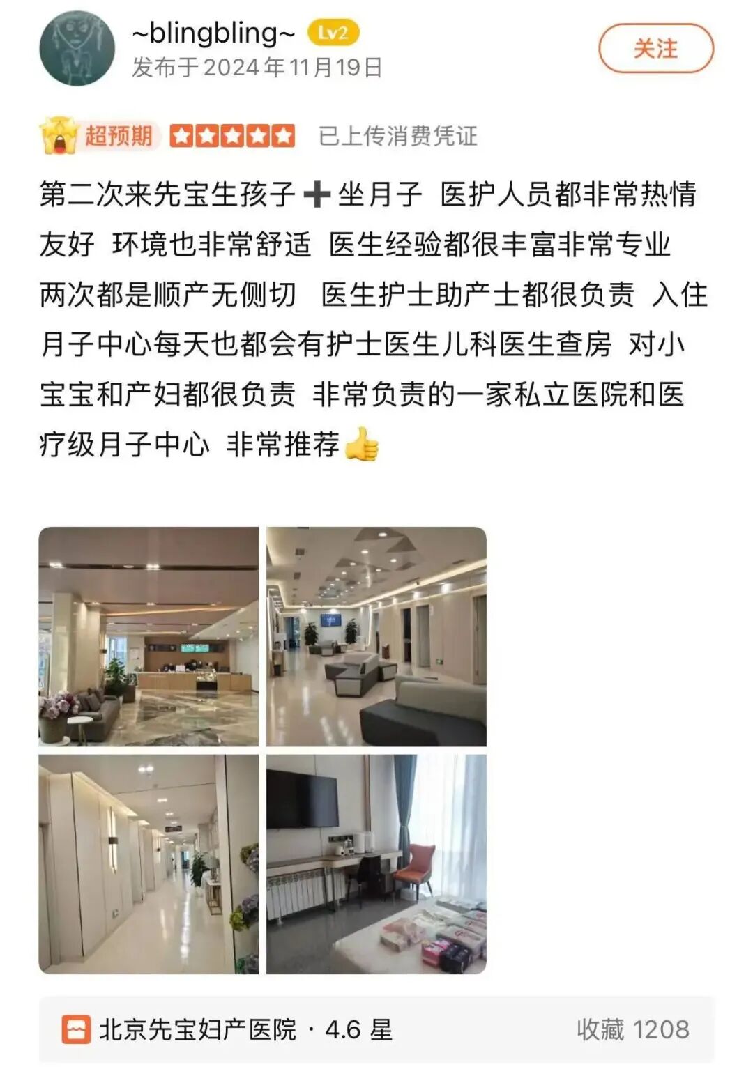 “环境舒适,医生经验非常丰富、非常负责,两次都是顺产无侧切。入住之后还会有儿科医生、护士定期查房,让人很安心,非常推荐”
